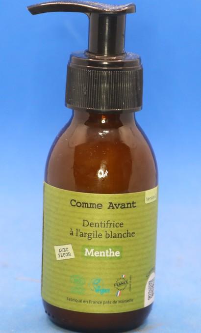 Les dentifrices « Comme Avant » sont faites en pâte d’argile blanche. Sa texture agréable en bouche et sa fine mousse nettoient en toute douceur les dents des petits et grands ; doté d’un flacon en verre avec pompe il permet de respecter la bonne dose d’utilisation !